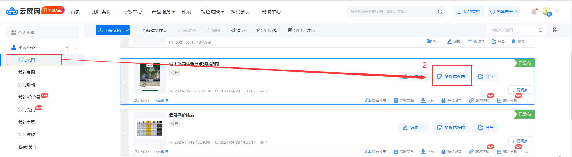 点进【我的文档】/【文档】,选择对应电子书,点击【多媒体编辑】/【内容编辑】。