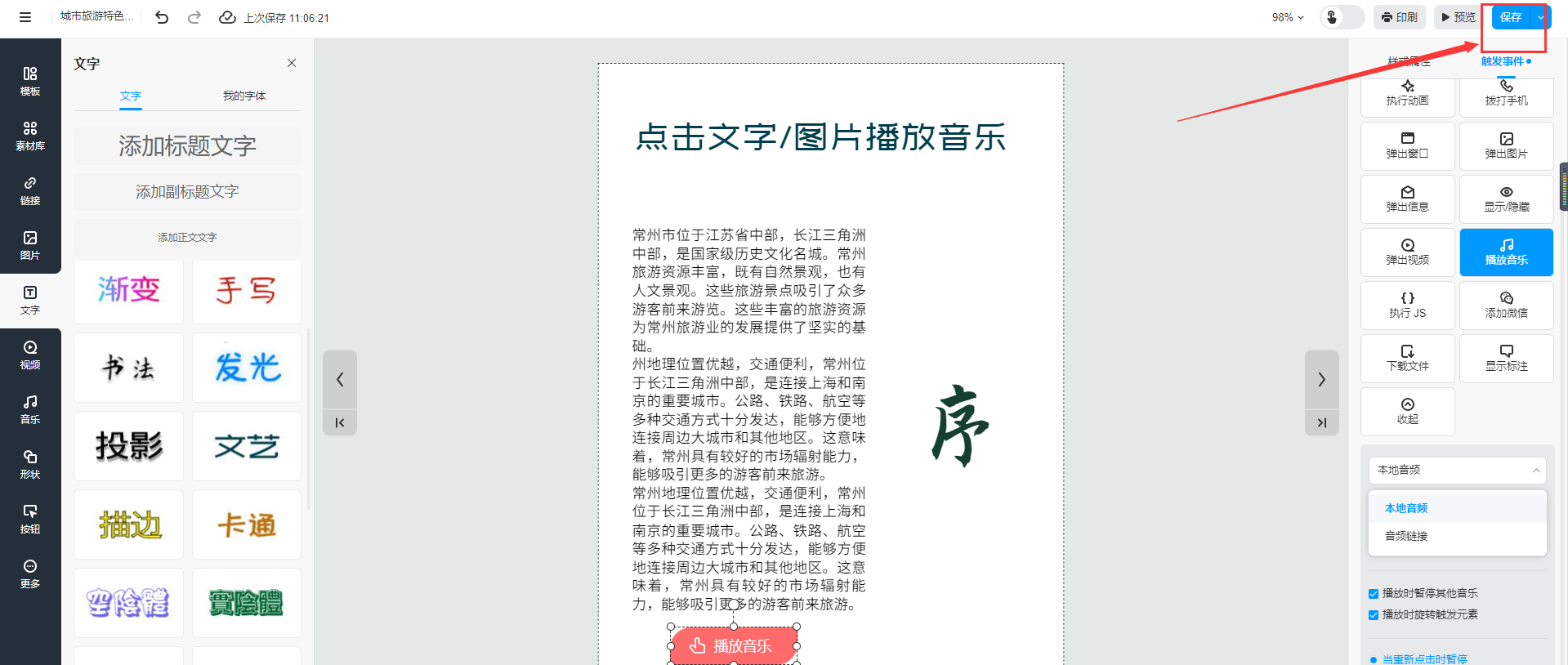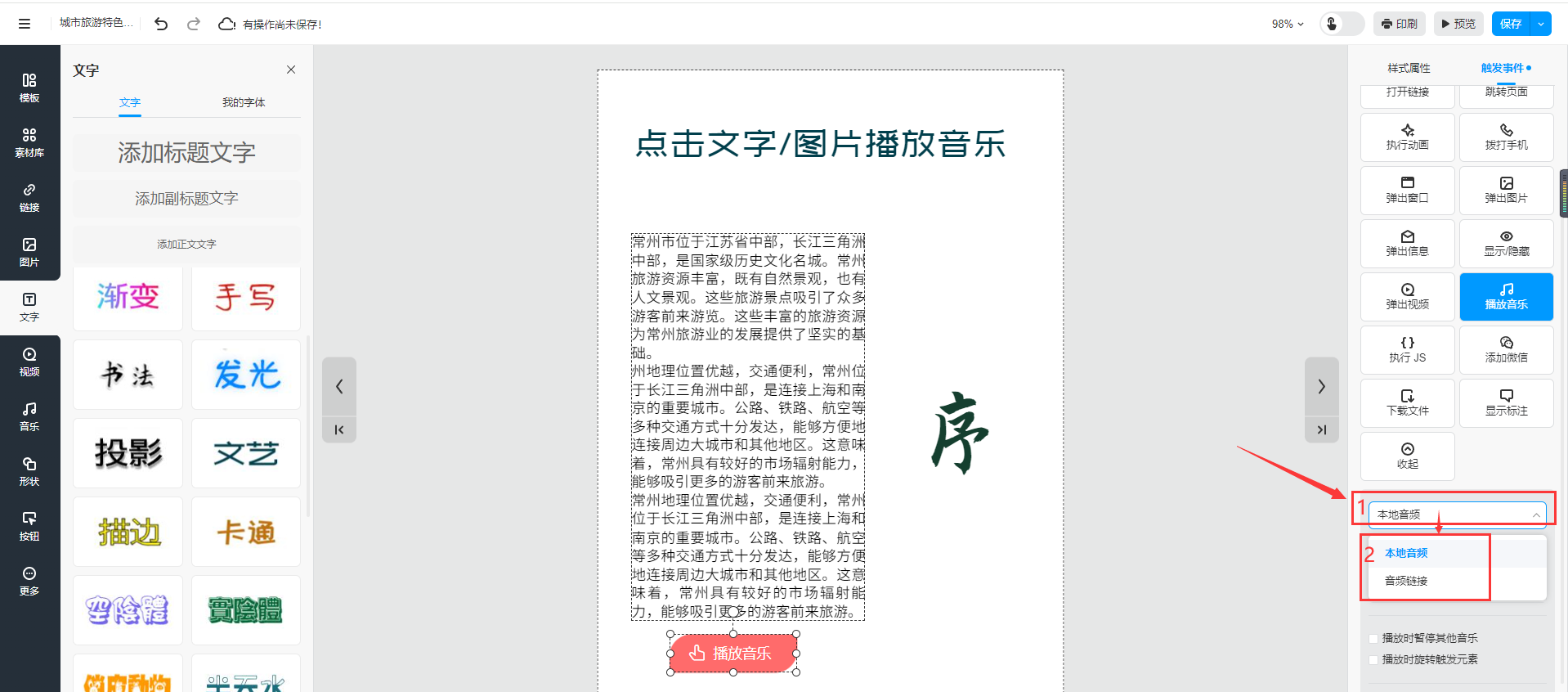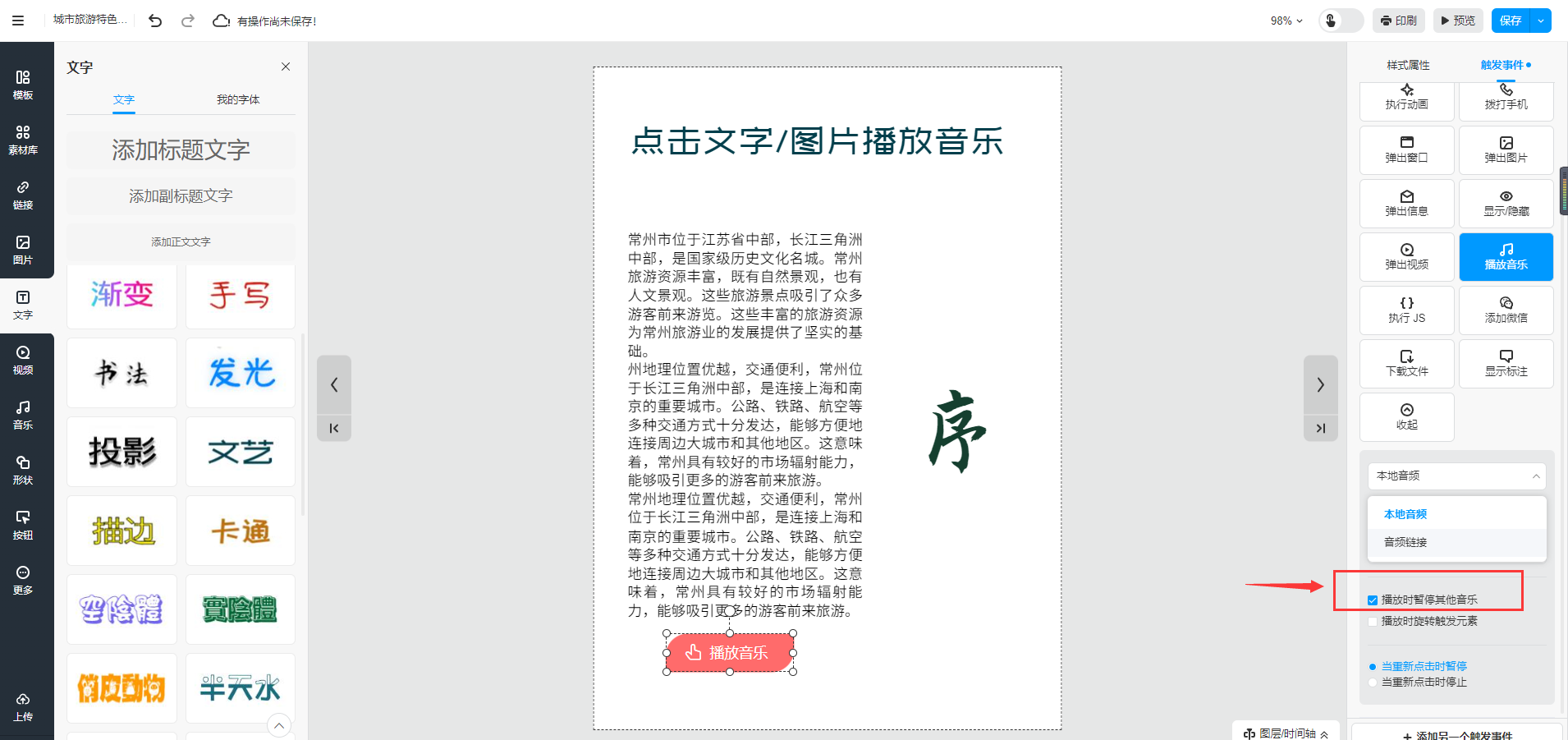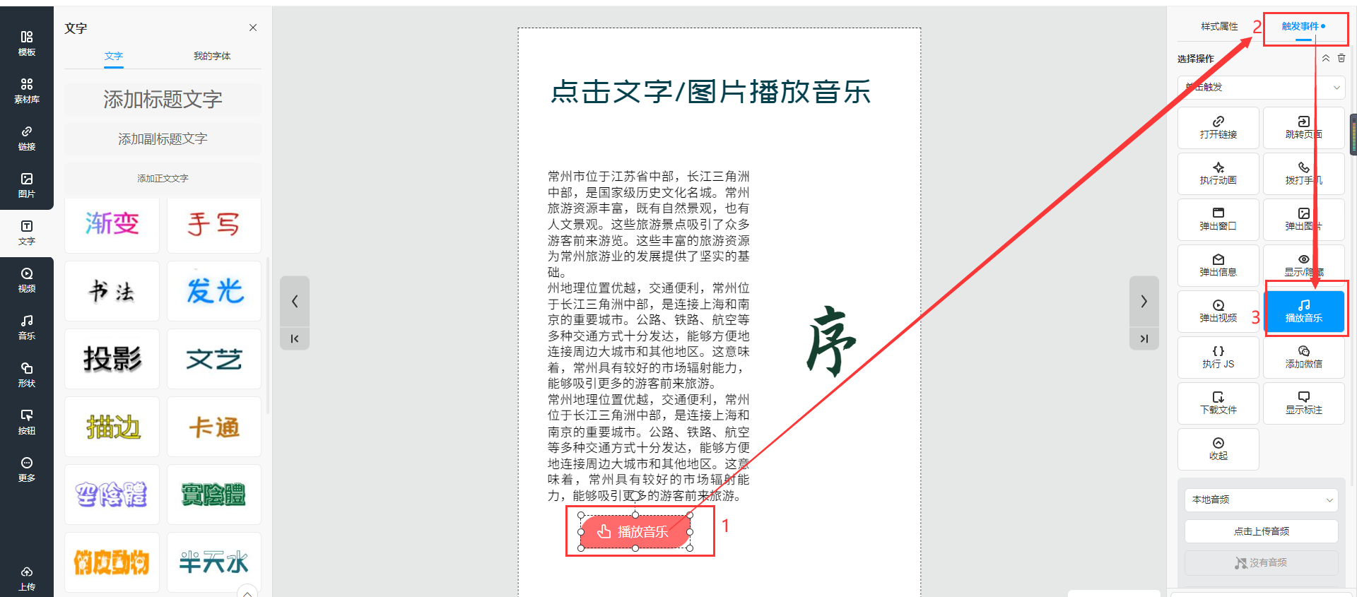 选中需要播放音乐的文字或者图片,然后点击【触发事件】选择【播放音乐】