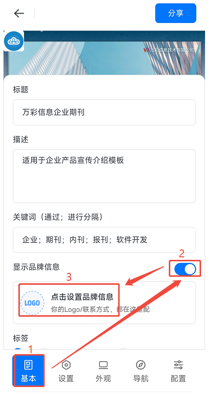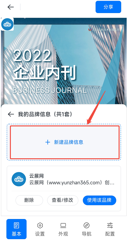 点击【基本】,打开【显示品牌信息】,然后点击【点击设置品牌信息】,最后点击【新建品牌信息】。