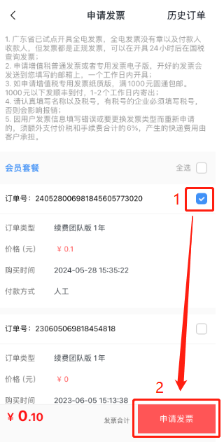 勾选需要申请发票的订单,然后点击【申请发票】。