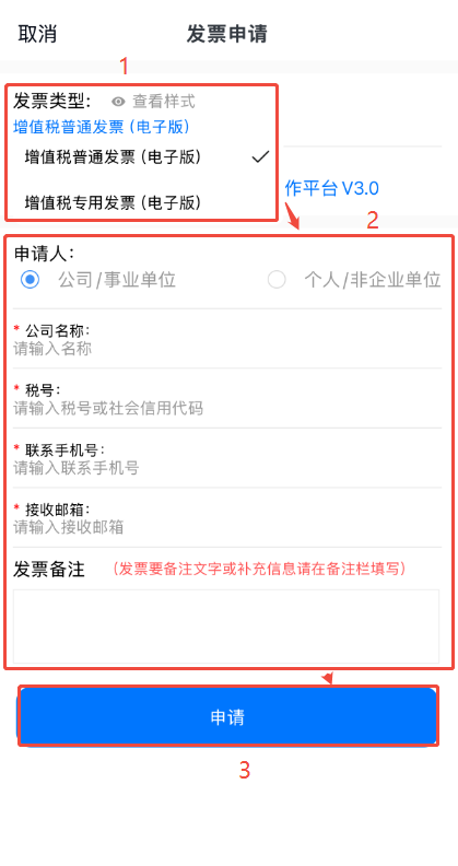 点击【增值税普通发票(电子版)】,选择发票类型然后填写相关信息,信息要确保无误,如需在发票上备注文字,或者普票需要补全地址电话开户行账号的,请在发票备注栏上填写,避免影响报销,填写完点击下方【申请】即可。