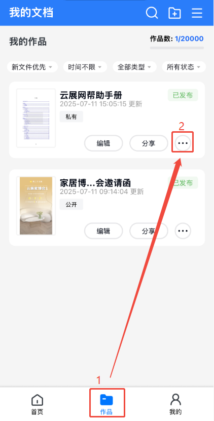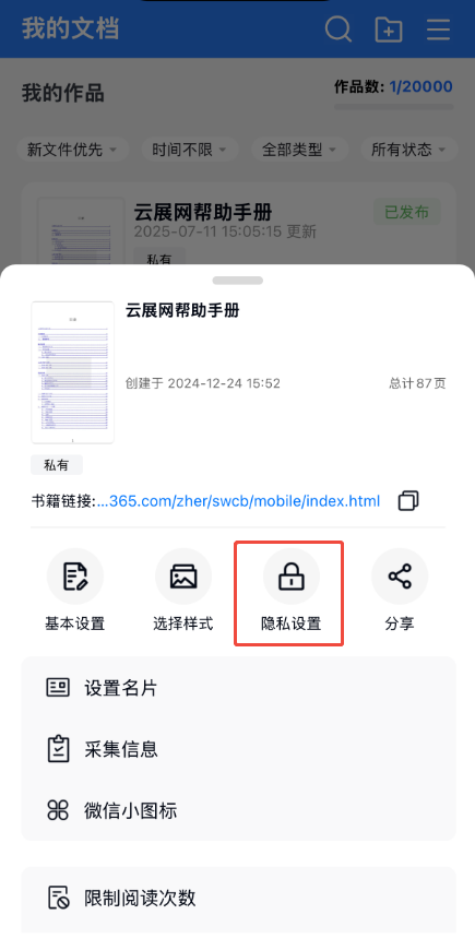 打开云展app,点击【作品】,点击书本旁边三个点,然后点击【隐私设置】。