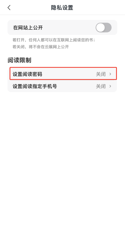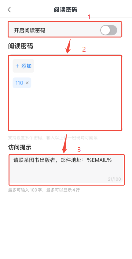 点击【设置阅读密码】,将【开启阅读密码】打开,在下方密码框输入密码,可以输入一个或者多个,也可以根据自己需要设置访问提示,设置完点左上角箭头退出即可。