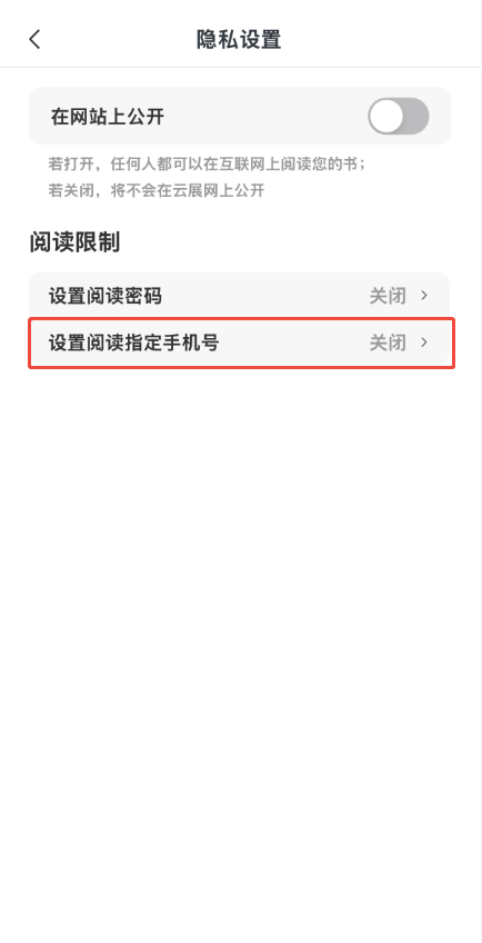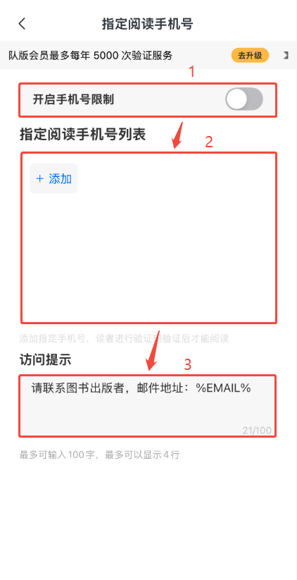 点击【设置阅读指定手机号】,将【开启手机号限制】打开,在下方手机号列表框输入手机号,可以输入一个或者多个,也可以根据自己需要设置访问提示,设置完点左上角箭头退出即可。