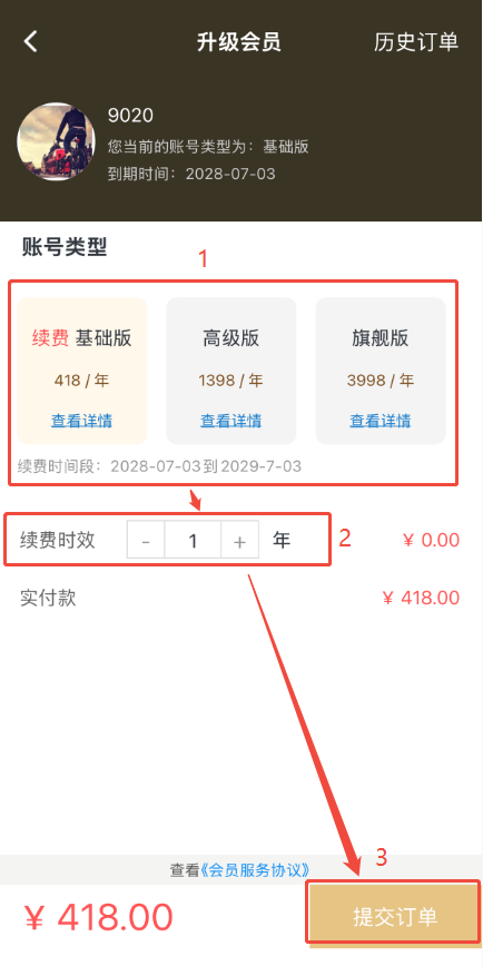 选择需要购买的会员版本,输入购买时效,付款金额确认无误后,点击【提交订单】,提交之后点击【确认支付】付款即可,付款后系统会自动开通,如需对公转账需要先联系客服把付款单位名称跟云展网登录手机号发给客服备注,到账后开通。