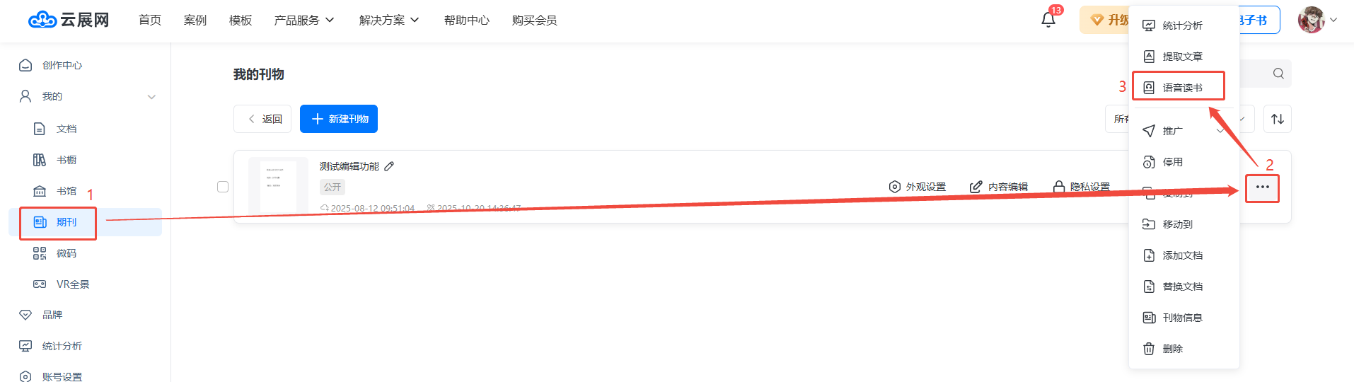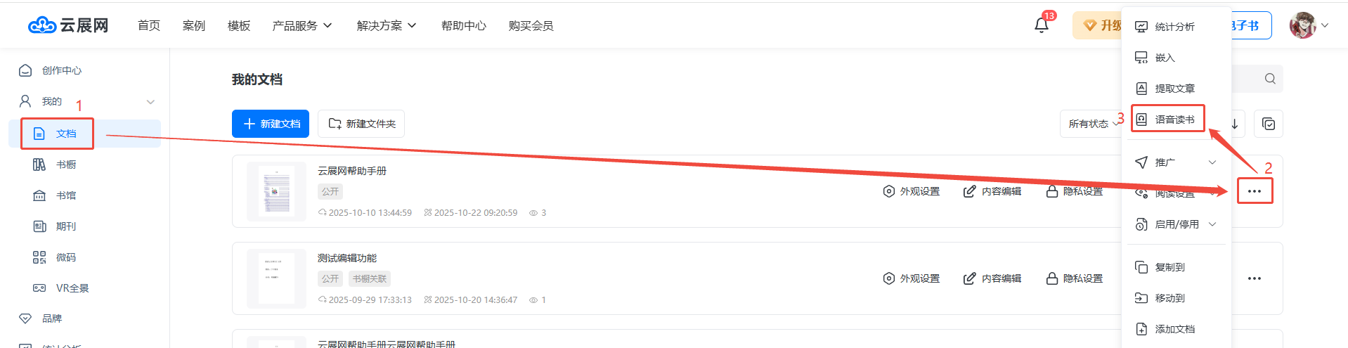 点击【文档】或【期刊】找到需要设置的书,点击右方三个点,然后点击【语音读书】。