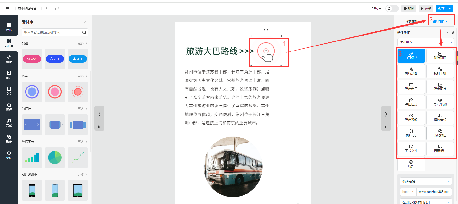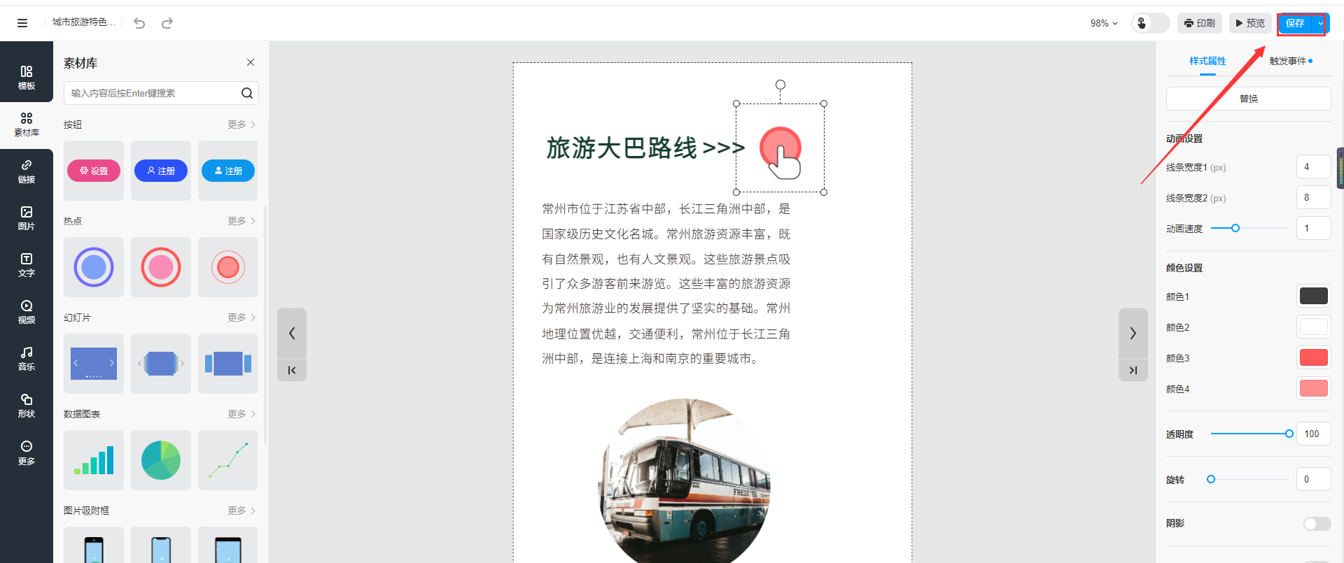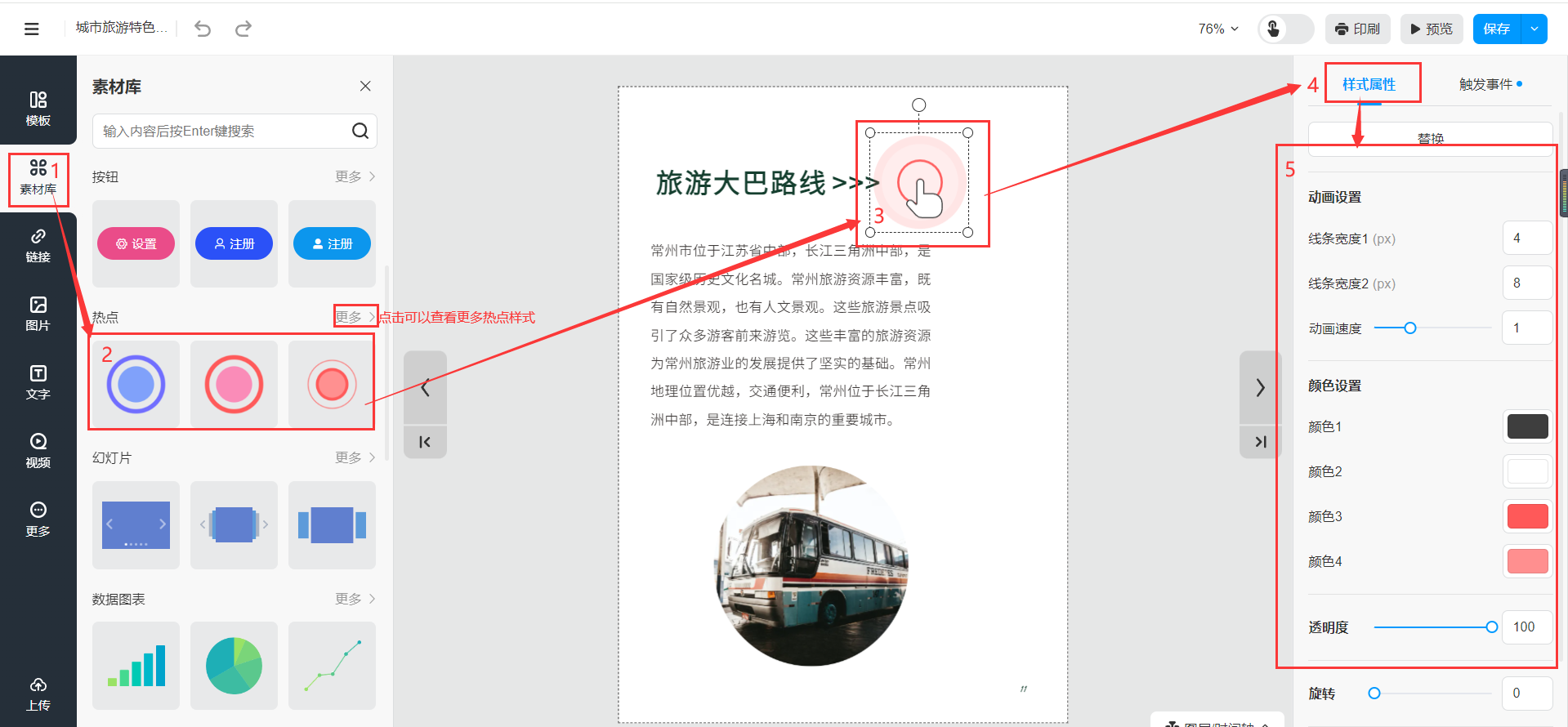 点击【素材库】,选择【热点】添加在页面合适的位置上,右侧点击【样式属性】可更改热点样式