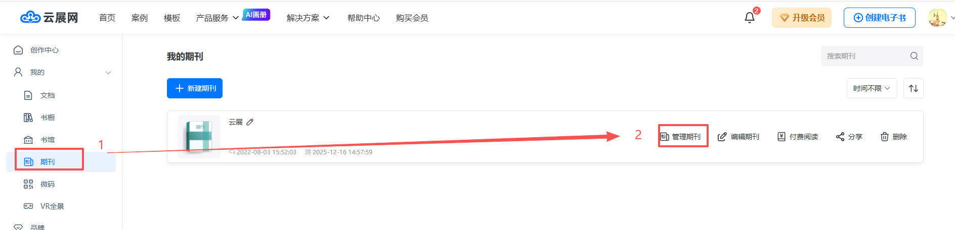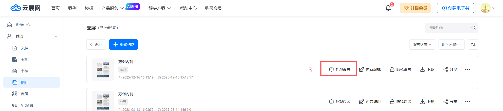应用报刊模板 一、功能介绍 云展网提供专用于数字报刊/期刊的模板,适用于制作报纸类书籍,便于读者查阅。 二、操作步骤 1、打开编辑界面 在【期刊】页面,点击【管理期刊】打开,选择需要设置报刊模板的书,点击【外观设置】。 2、设置数字报专用模板 点击【外观】,点击【模板】,电脑/手机端都选择数字报专用模板。