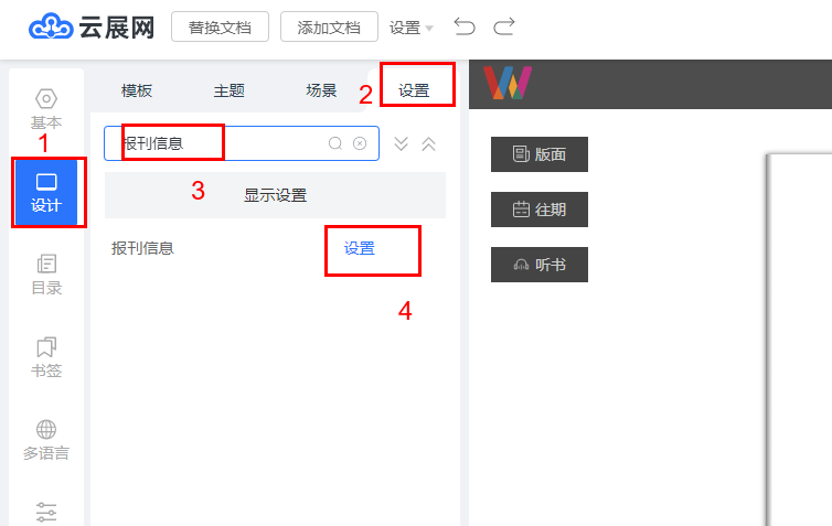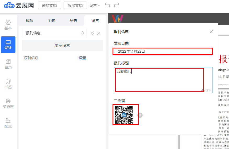 如何设置报刊信息 一、功能介绍 报刊信息主要作用于让报刊看起来更专业一点,并且您可以添加二维码方便读者联系您。 二、操作步骤 1、在【我的期刊】找到需要设置的书,点击【编辑】 2、点击【设计】,【设置】,搜索报刊信息,点击【设置】 3、输入发布日期,标题,上传二维码图,二维码图可以是您的微信二维码,设置好以后保存