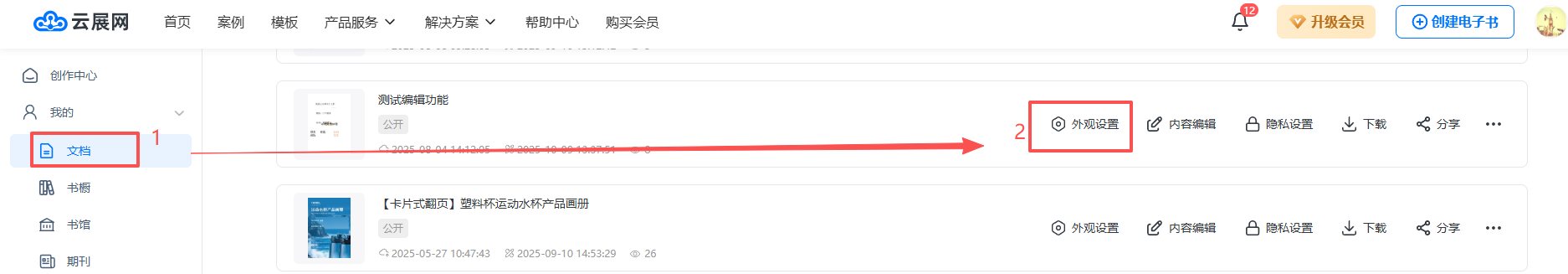 1、在【文档】页面,点击【外观设置】打开书籍编辑器。