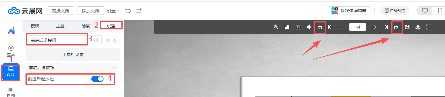 2.点击设计,点击设置,在搜索栏输入“前进后退按钮”,设置为显示。