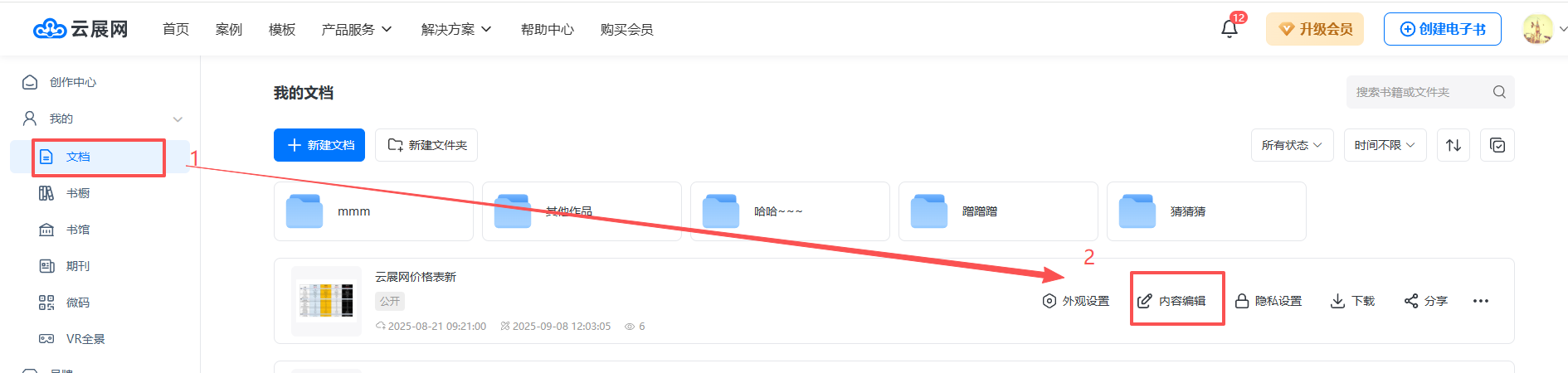 1、在【文档】页面,点击【内容编辑】打开。