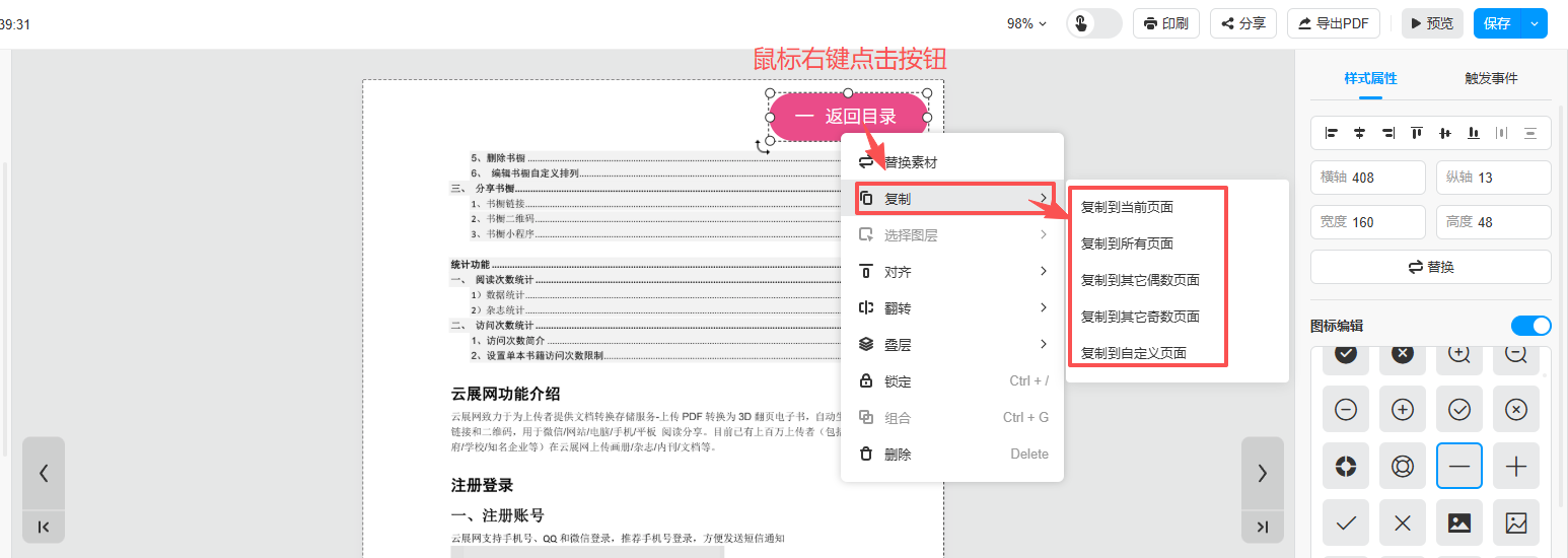 4、右键点击返回目录按钮,将其复制到除了封面封底以及目录页以外的其他页面,因为复制的按钮位置是统一的,所以排版的时候需要在每一页给按钮留个位置。