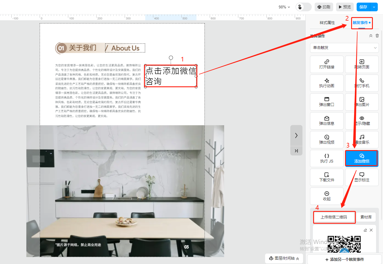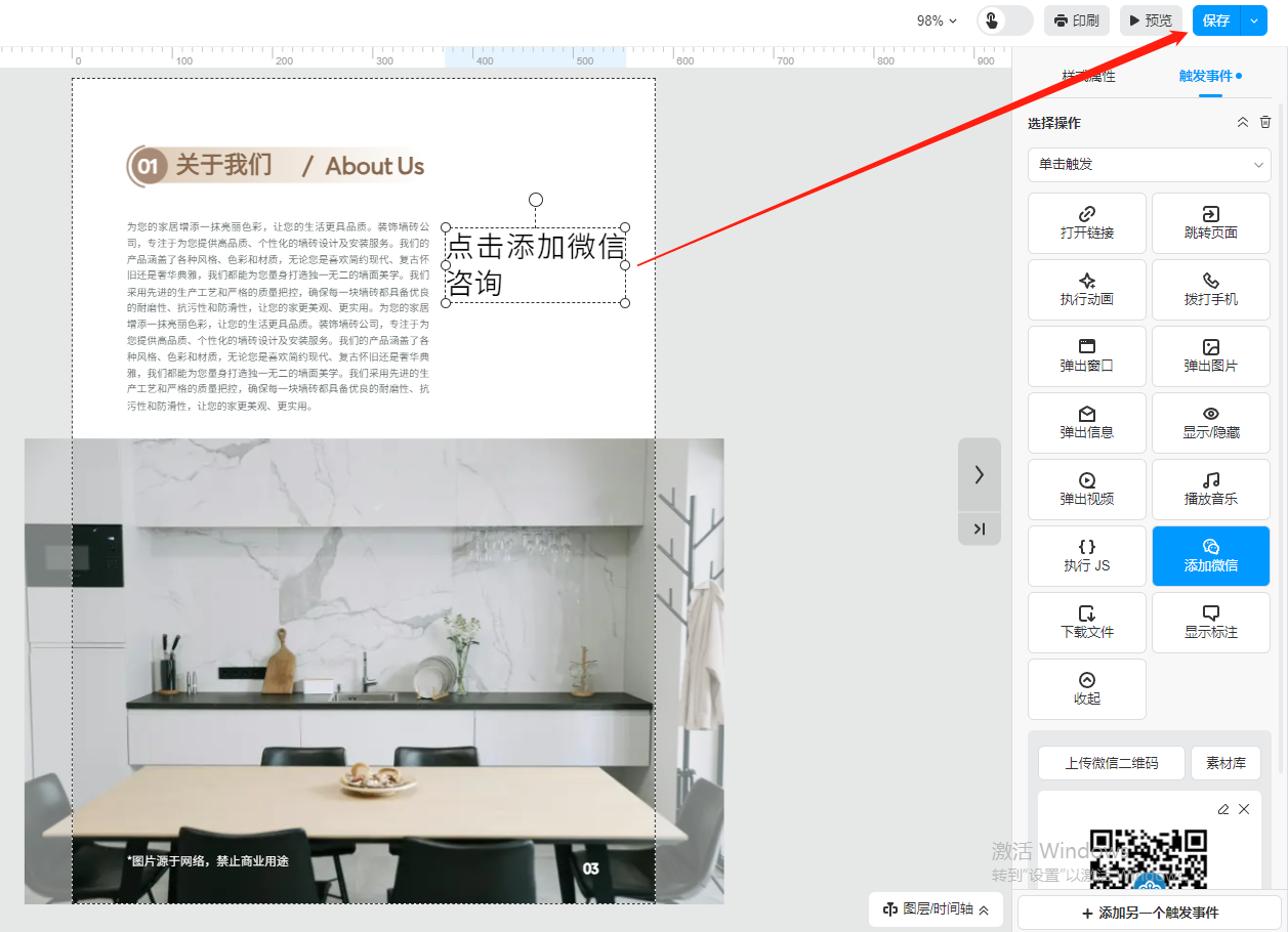 选中需要弹出微信二维码的文字或者图片,点击右上角的【触发事件】,选择【添加微信】,然后点击【上传微信二维码】上传微信二维码图片。