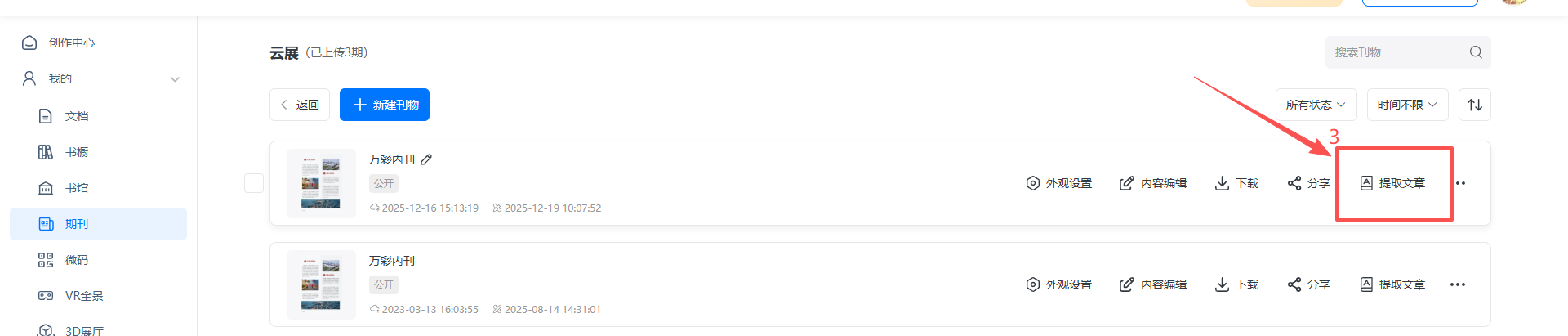 点击【期刊】,点击【管理期刊】打开后,找到对应的电子期刊,点击【提取文章】。