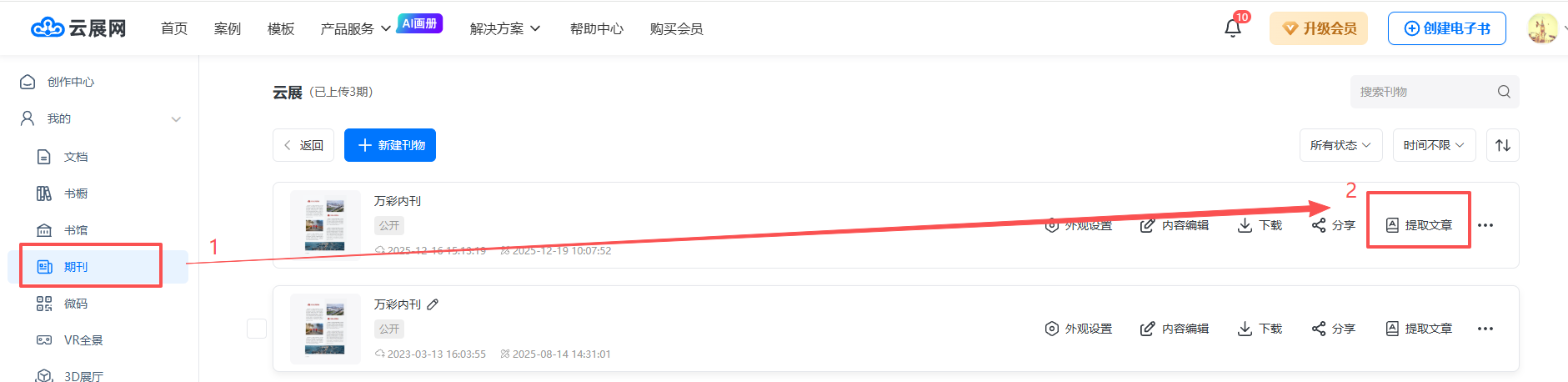 文章添加图片 一、功能介绍 在文章中添加图片,即在提取文章内容时,可适当插入图片,让整个版面更生动形象,提升读者的阅读体验。此功能仅高级版及以上会员支持。 二、操作步骤 1、打开文章编辑界面 在【期刊】页面,找到对应的书籍,点击【提取文章】打开。 2、在文章内容里面插入图片 1)在选择文字/图片页面,点击图片插入到文章里 2)插入本地图片 点击【上传图片】按钮,浏览本地文件,选择图片插入 3、保存文章 编辑好文章内容后,点击【保存文章】保存。