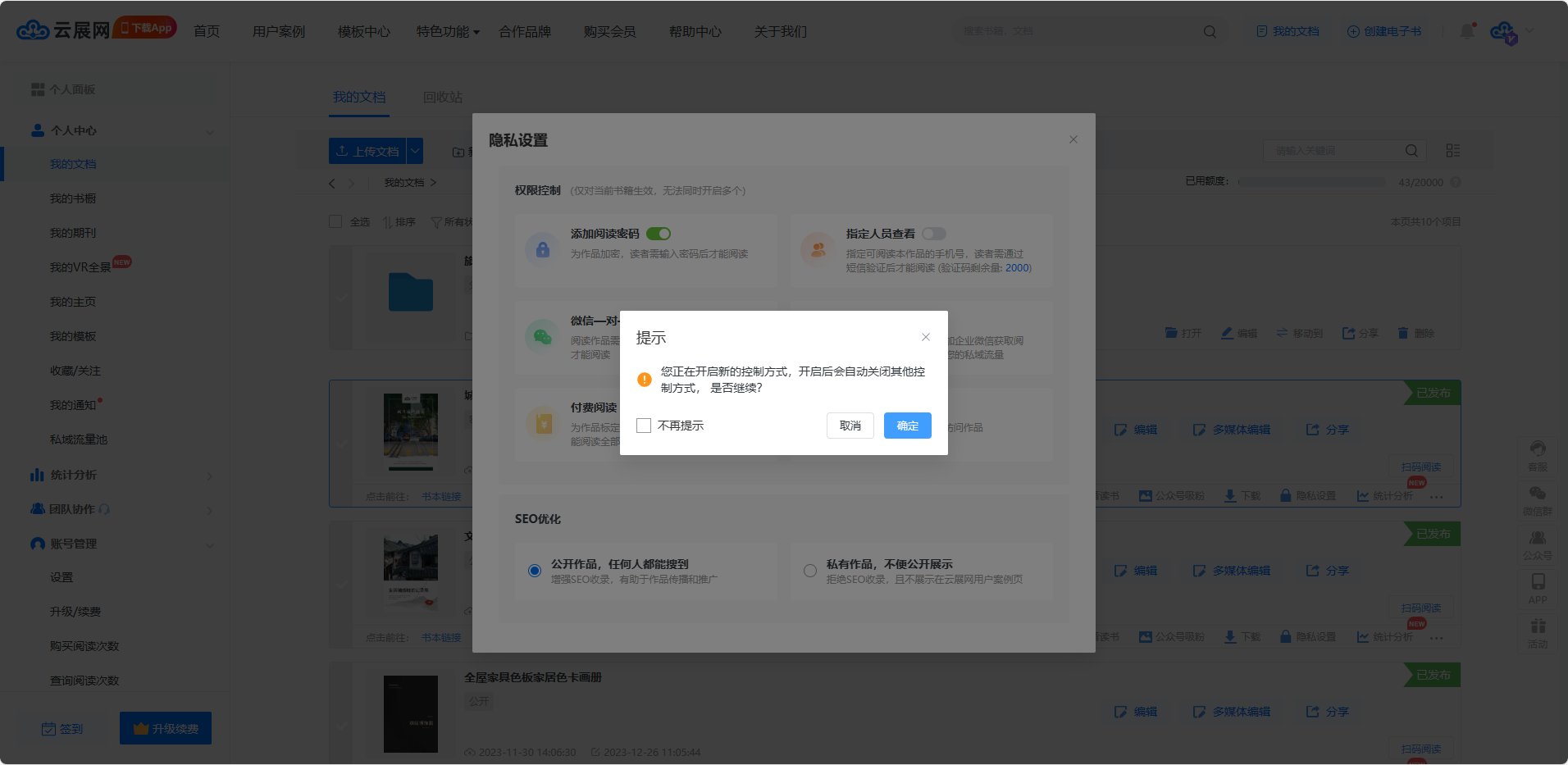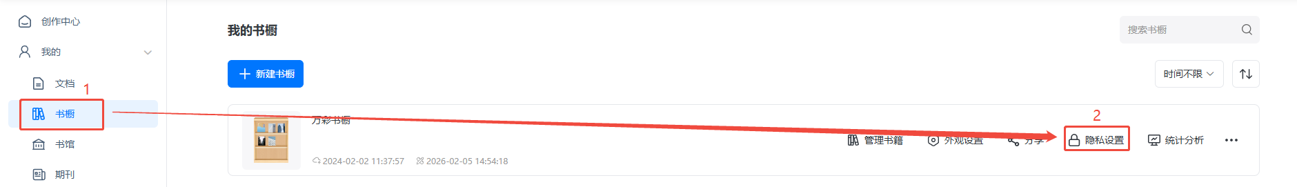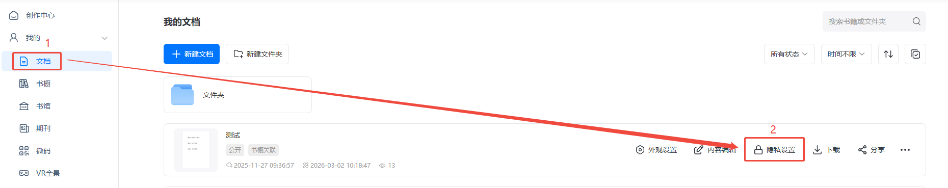 点进【文档】/【书橱】,找到对应电子画册/书橱,然后点击【隐私设置】。