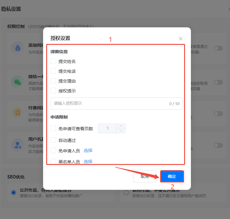 - 弹窗信息:就是读者打开书本/书橱,弹出窗口显示的文字信息。勾选提交姓名/提交电话/理由让读者填写,方便您判断这个读者是否可以查看书本/书橱,授权提示可以写一下联系方式,用于提示读者如何联系您