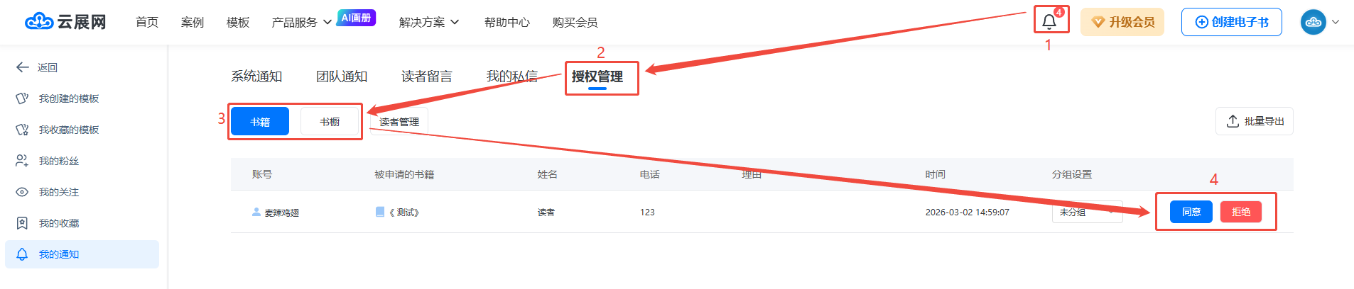 读者申请后,点击右上角的铃铛图标,然后点击【授权管理】,再点击【书籍】/【书橱】,就能看到申请的读者列表,选择【同意】或者【拒绝】。