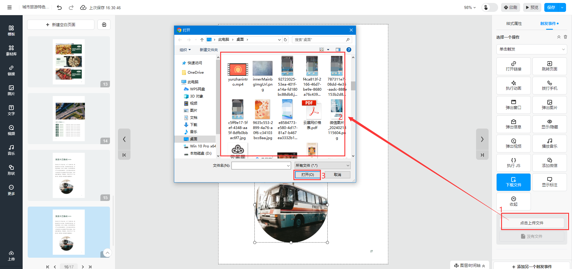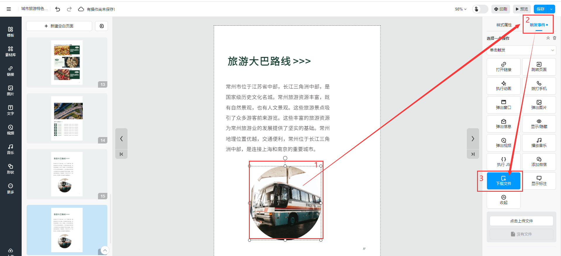 选中需要添加附件的文字或者图片,点击【触发事件】,选择【下载文件】