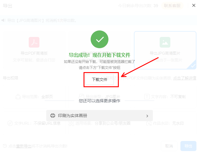 导出成功后,文件就会自动下载到你的浏览器上,如没有下载成功,可点击【下载文件】再次下载。
