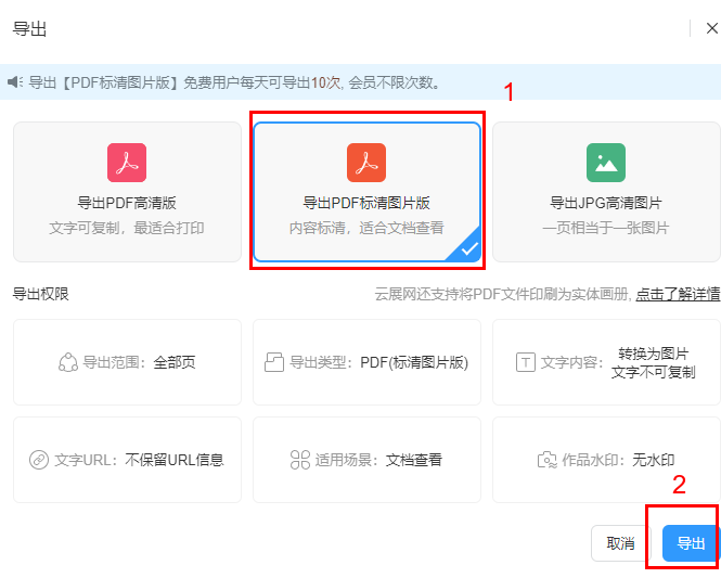 免费版用户仅支持导出PDF标清图片版,并带有水印。购买会员可以去除水印。