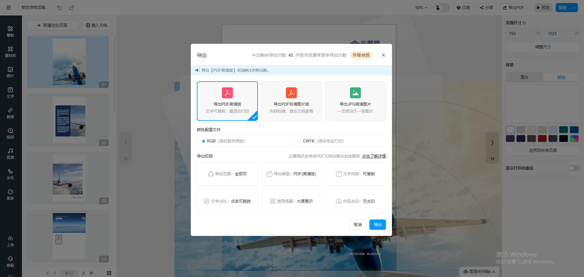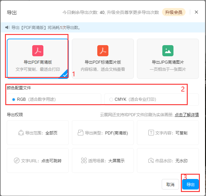 选择【导出PDF高清版】,选择【颜色配置文件】RGB或者CMYK,点击【导出】。