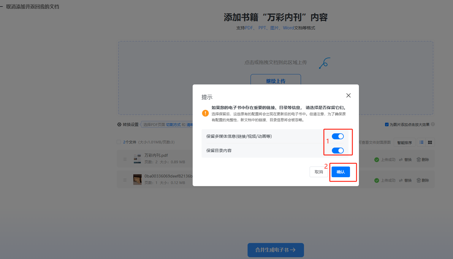 4、如果书本中有存在超链接/视频/动画和目录等功能,并且您需保留这些功能,请勾选“保留多媒体信息(链接/视频/动画等)”和勾选”保留目录内容”,勾选后点击【确认】。