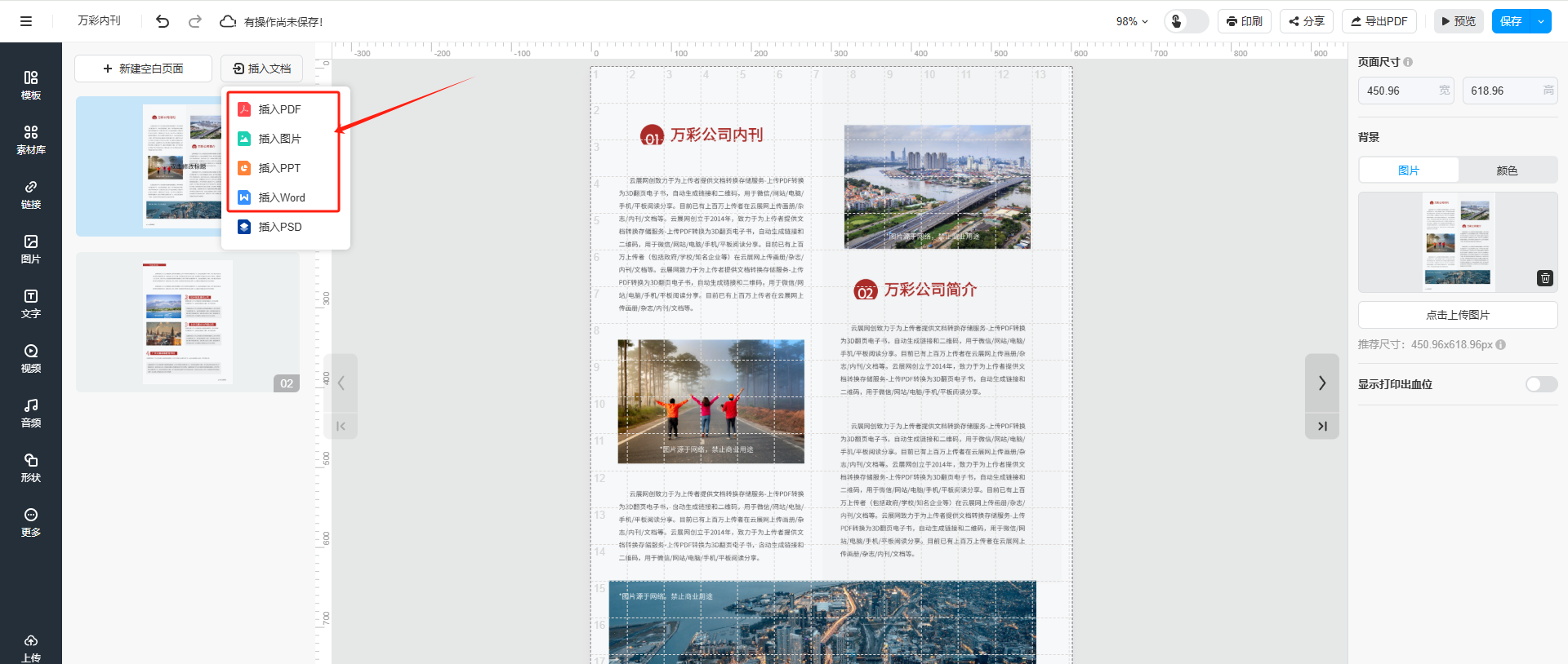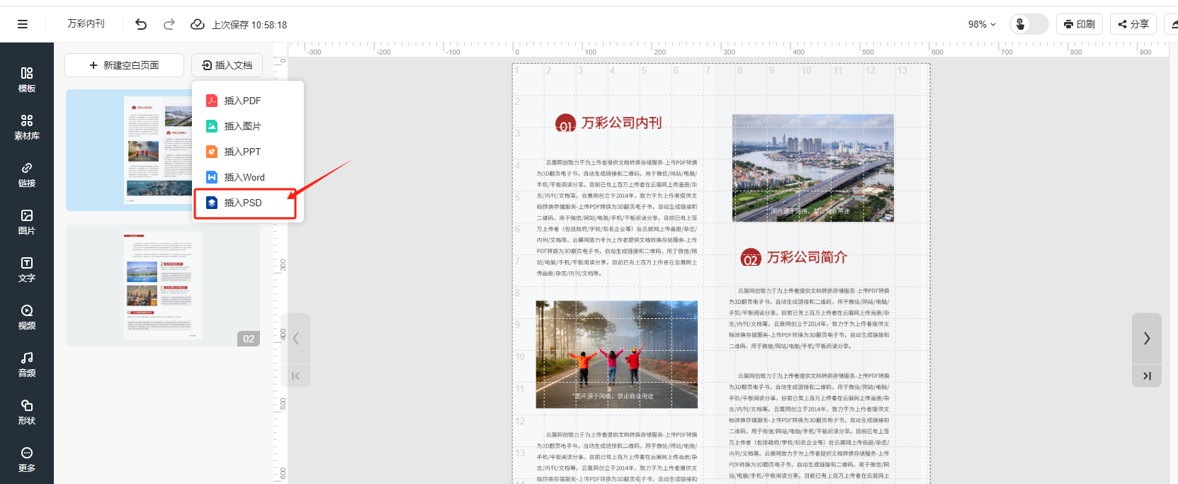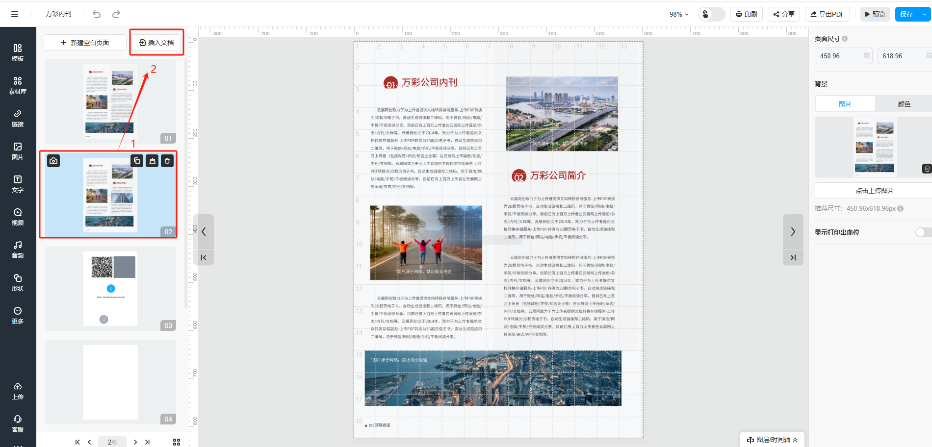 云展网支持给做好的书本增加页面。例如您制作的产品手册需要增加产品页,给企业内刊新增页面内容都可以使用这个功能。