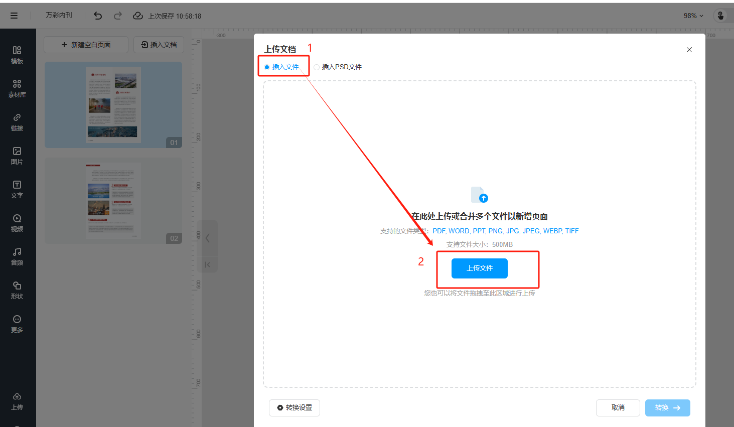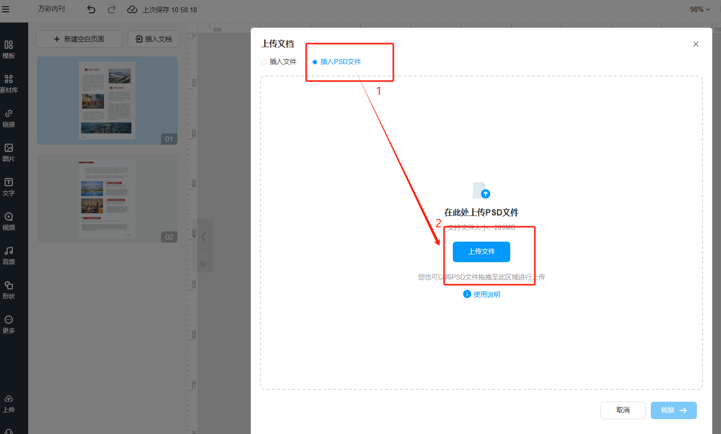 (b)插入PSD格式文件,在插入PSD页面,点击【上传文件】上传。