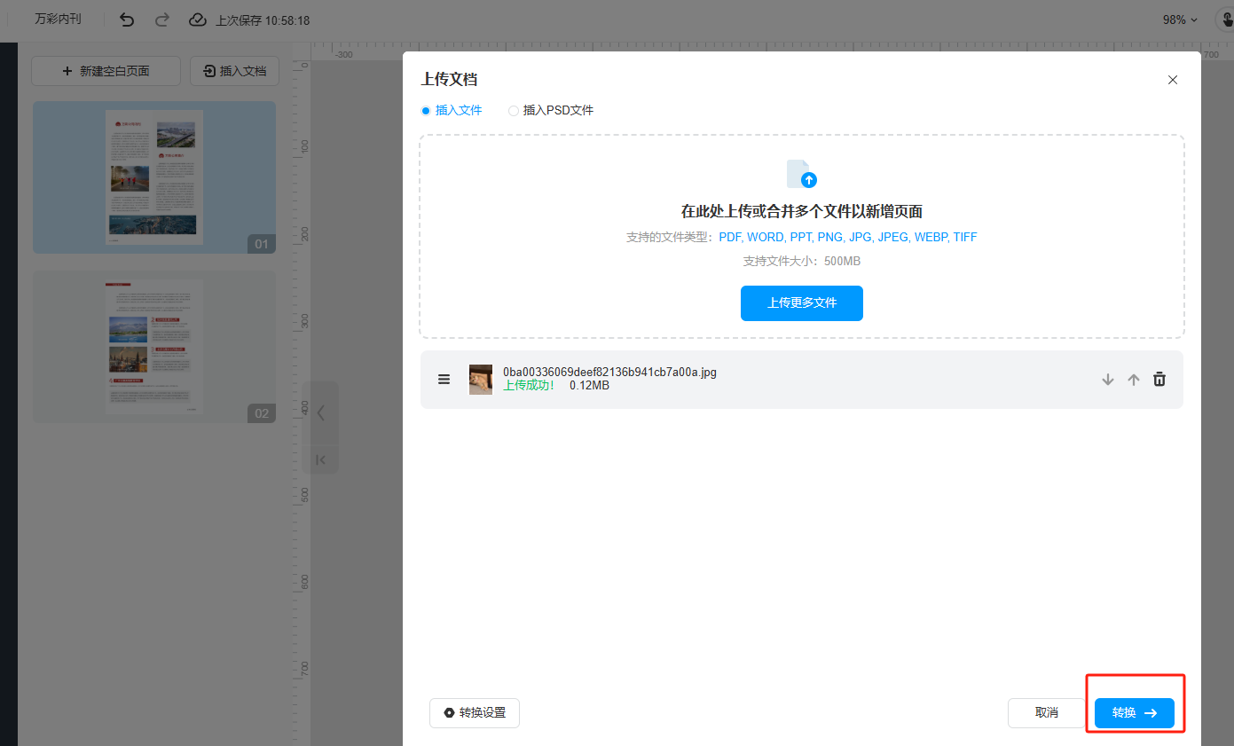 4、上传好文档后,点击【转换】。