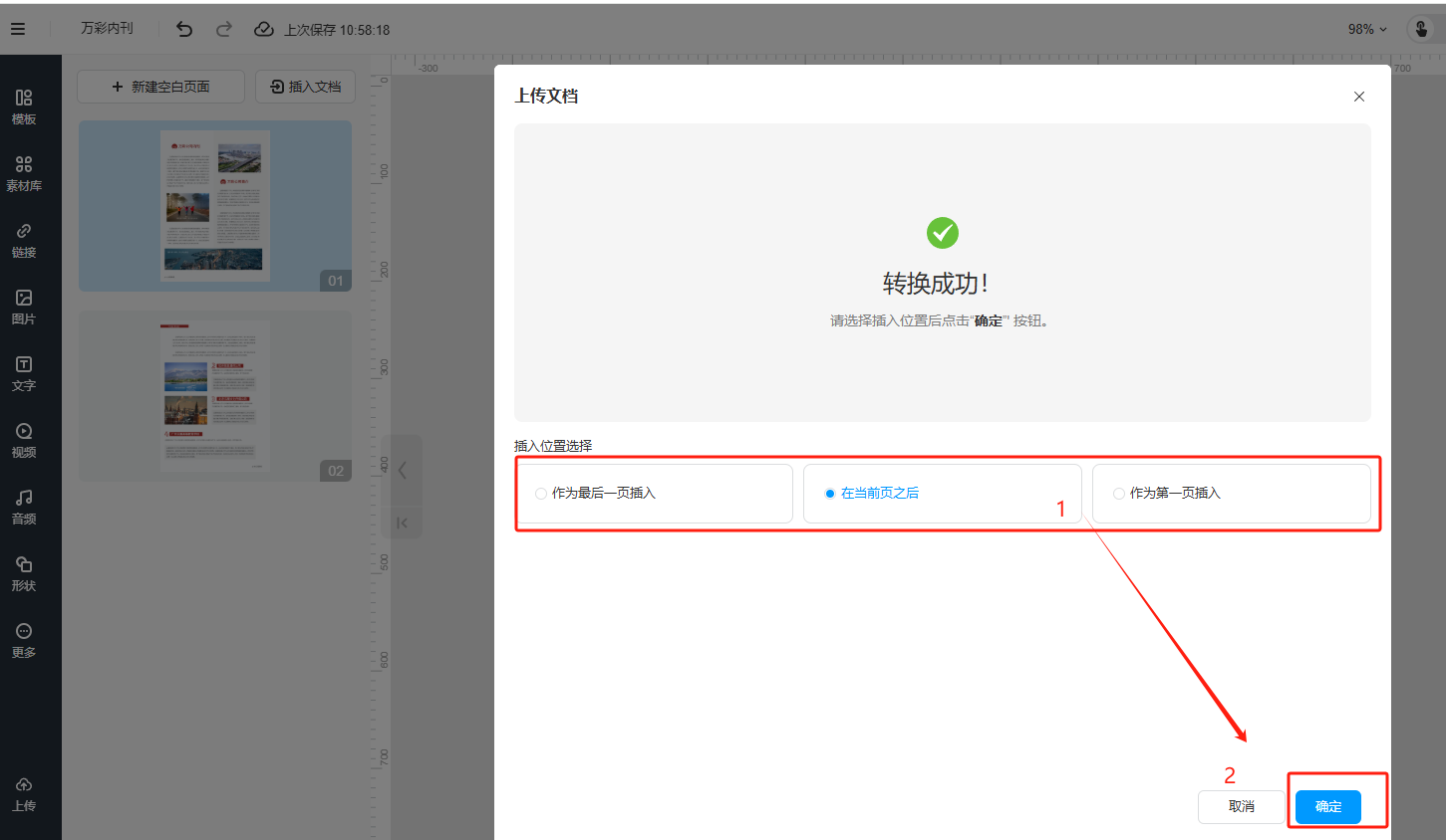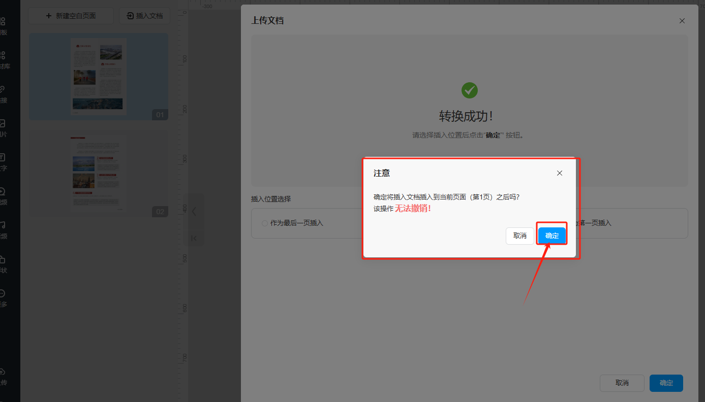 5、转换成功后,选择插入位置,然后点击【确定】。