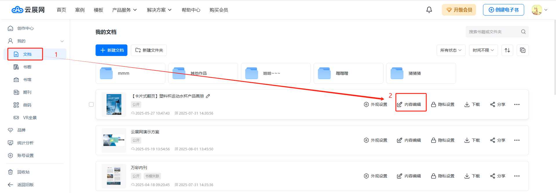 1、在【文档】页面,找到需要增加页面的书本后点击【内容编辑】。