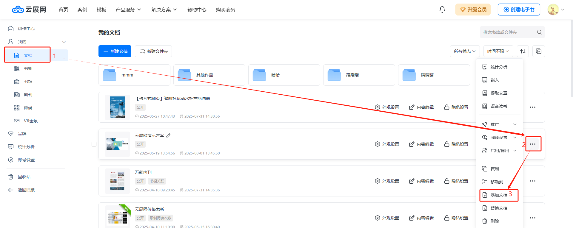 1、在【文档】页面,点击书本右边的“三个点”按钮,点击【添加文档】。