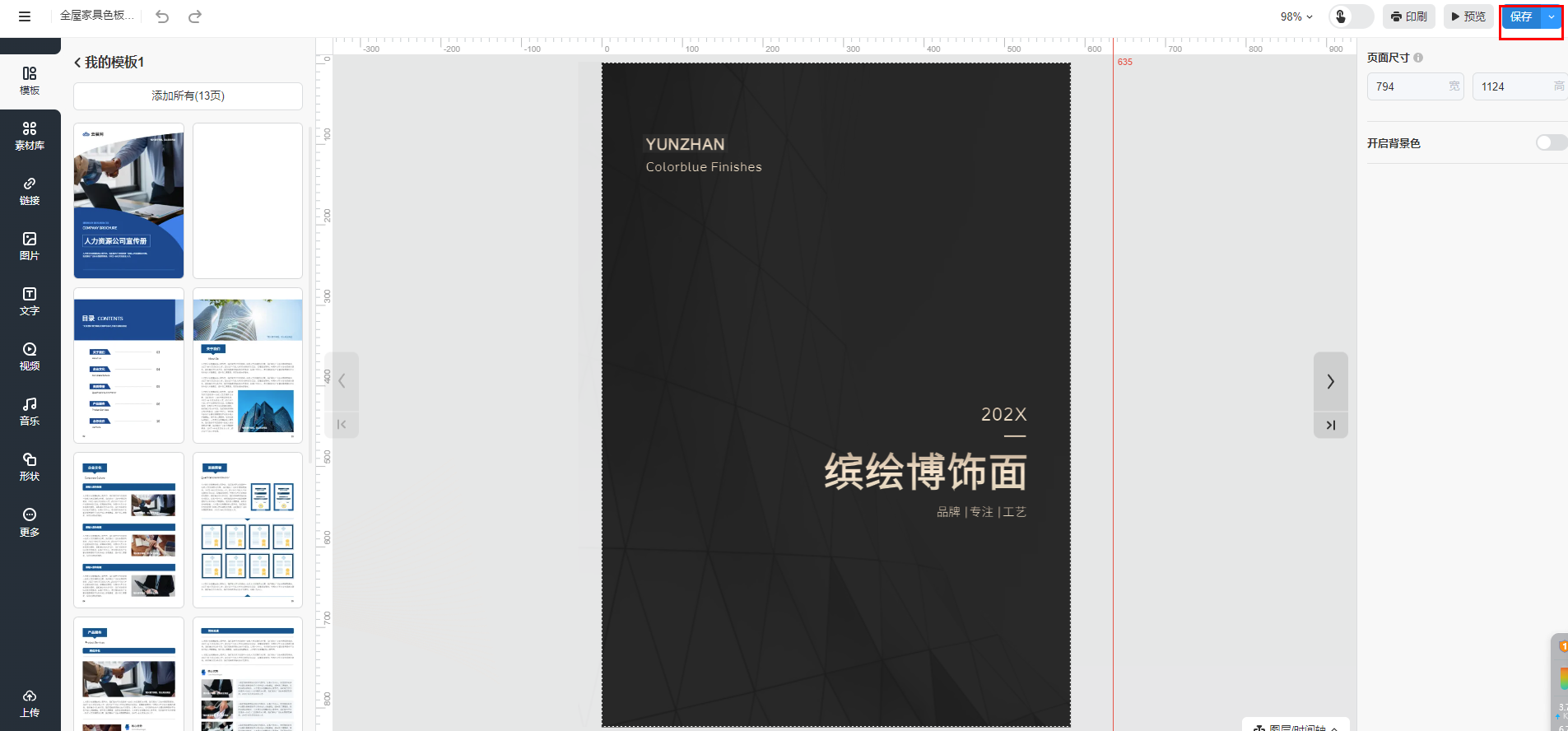 (2)制作好电子书后,在内容编辑器里,点击右上角的【保存】按钮,选择【另存为我的模板】。
