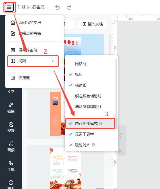 点击左上角的【三横杠图标】,点击【视图】,勾选【内存优化模式】。