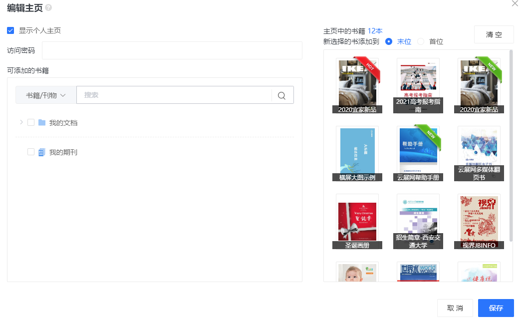 2、弹出编辑窗口后,点击文件夹,勾选需要展示的书籍并保存,设置私有的杂志将不会展示在主页。
