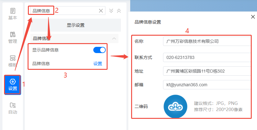 书橱添加品牌信息名片功能? 一、功能介绍 书橱上可以设置品牌信息名片,展示品牌名称、联系方式、地址、邮箱和二维码信息,可以有效提升个人或企业形象,并促进品牌与客户之间的互动与联系。 书橱品牌信息名片效果: 二、操作步骤 1、打开书橱编辑界面 点击【我的书橱】,再点击【管理书橱】,进入管理书橱界面。 2、设置品牌信息 点击【设置】,上方搜索品牌信息,打开【显示品牌信息】,并设置品牌信息。 3、保存 点击右上角的【保存/预览】按钮即可