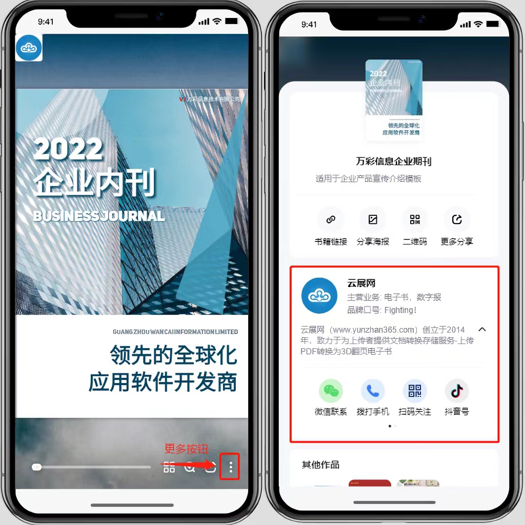 点击电子画册的【更多按钮】弹出品牌信息以及联系方式。