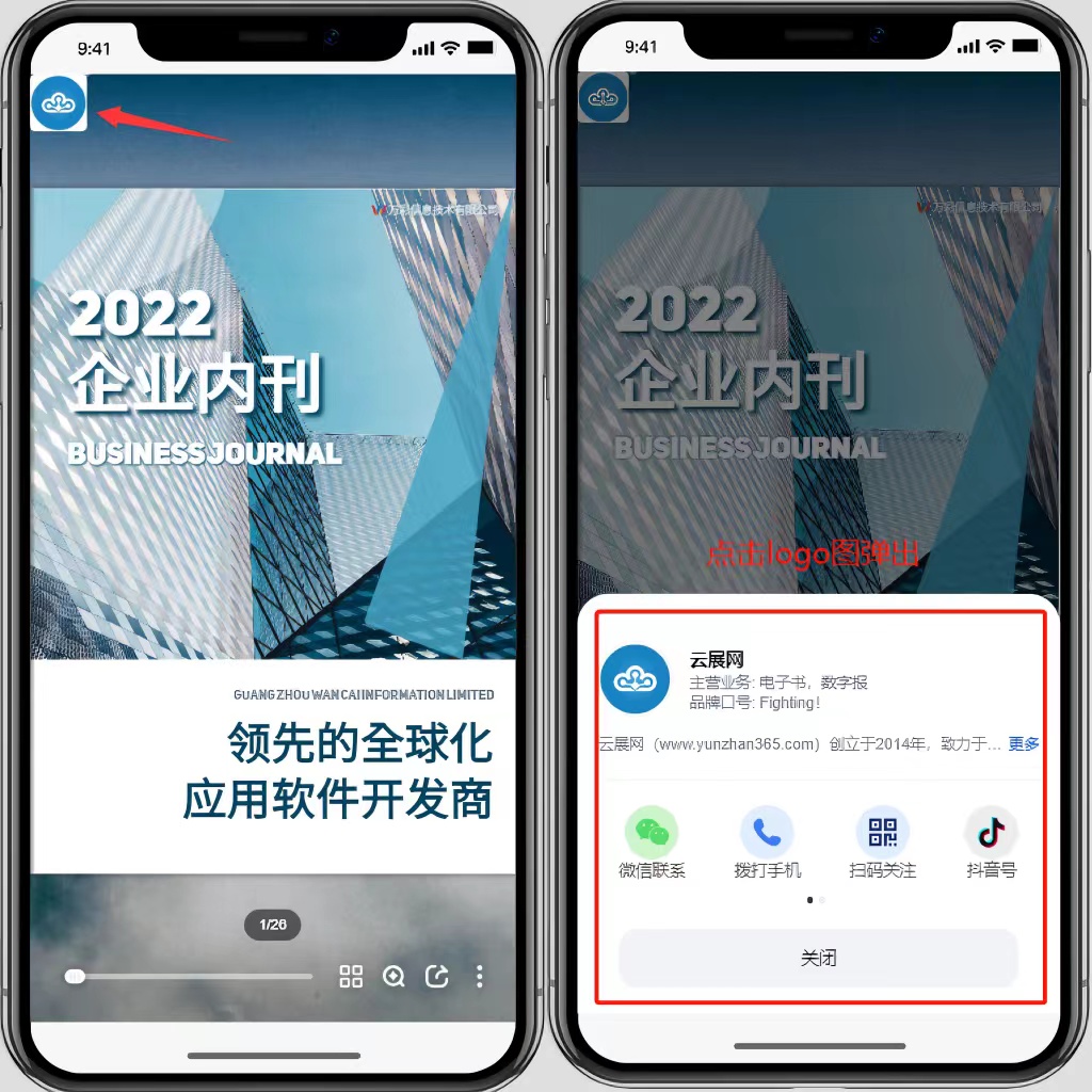 主要在电子画册的工具栏左上角显示Logo,移动端点击可弹出品牌信息、联系方式。