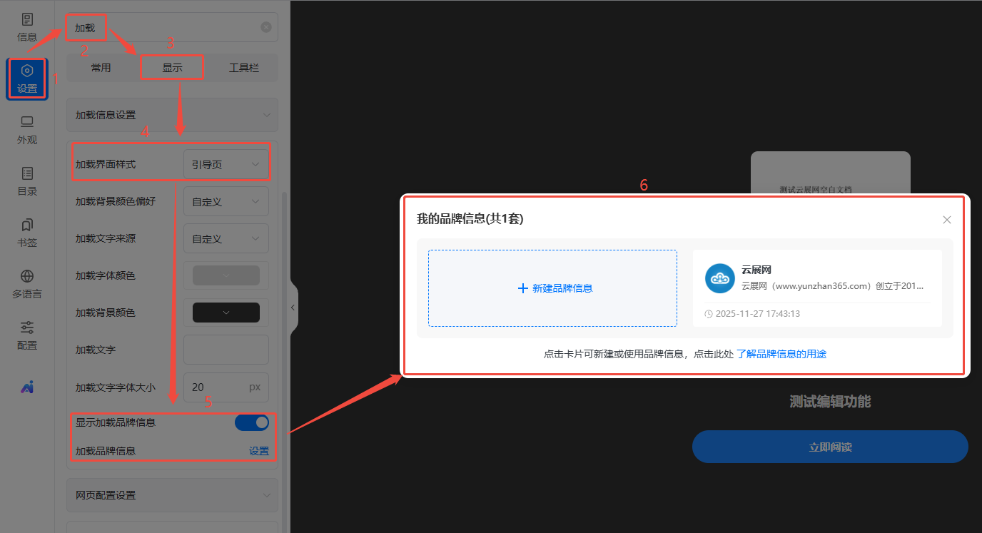 点击【设置】,搜索栏搜索【加载】,再点击【显示】,将【加载界面样式】改为【引导页】,然后打开【显示加载品牌信息】,最后选择使用一个创建好的品牌信息。