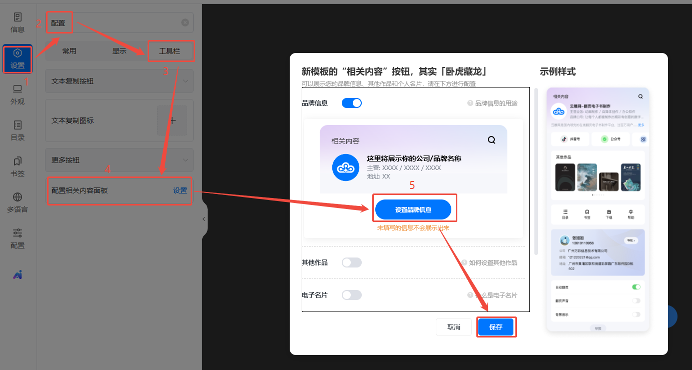 点击【设置】,搜索栏搜索【配置】,点击【工具栏】,设置【配置相关内容面板】,打开【品牌信息】,点击【设置品牌信息】,选择使用一个创建好的品牌信息,最后点【保存】。