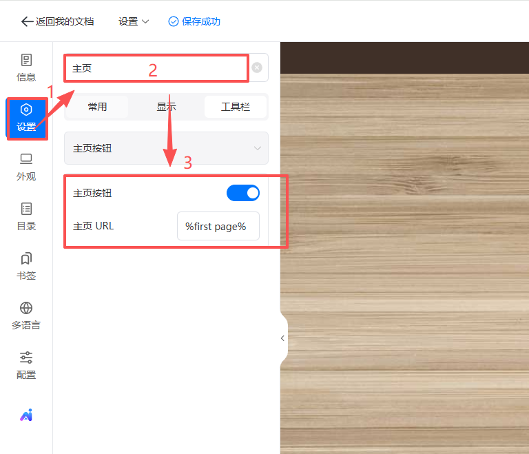 点击【设置】,在搜索栏中搜索“主页”,开启【主页按钮】,然后设置【主页URL】。默认情况下,将跳转至电子书首页;若需跳转至外链,可输入外链链接。