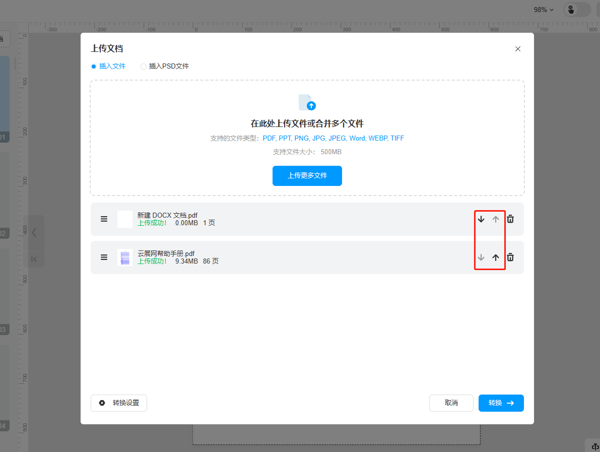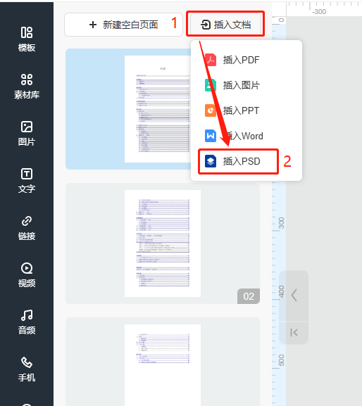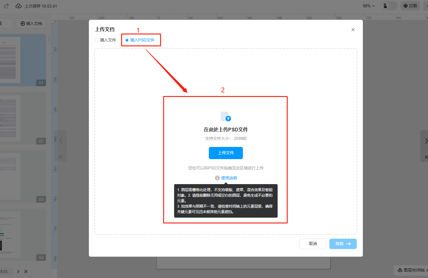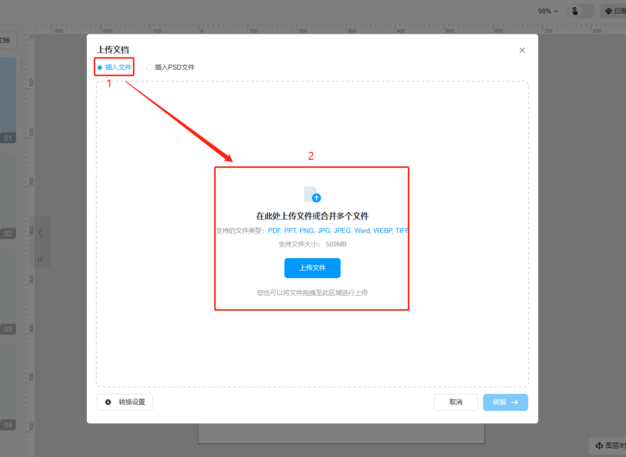 b)选择【插入PSD文件】,点击【上传文件】,上传PSD文件。