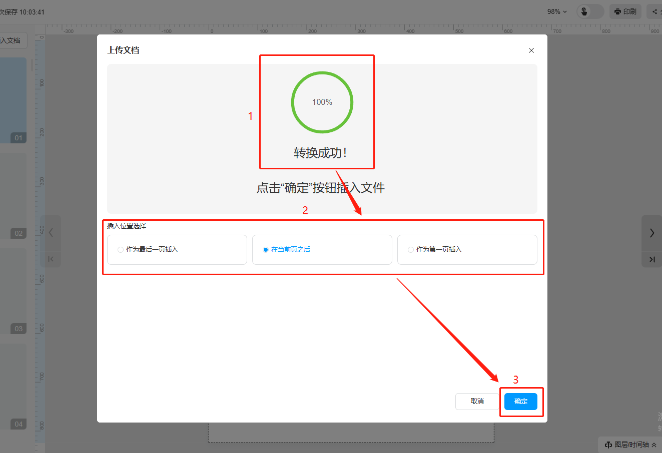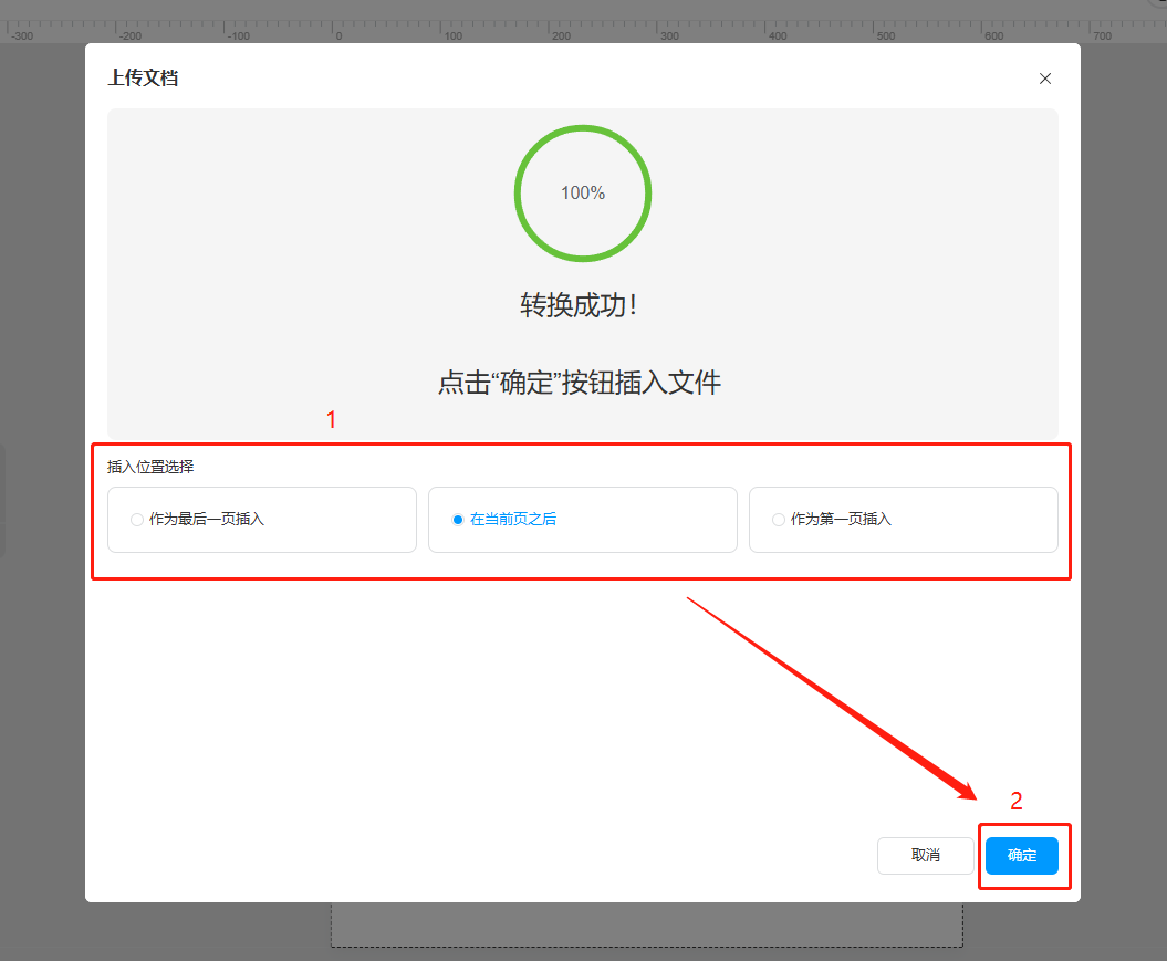 c)转换成功后,选择文档插入位置,并点击【确认】完成。