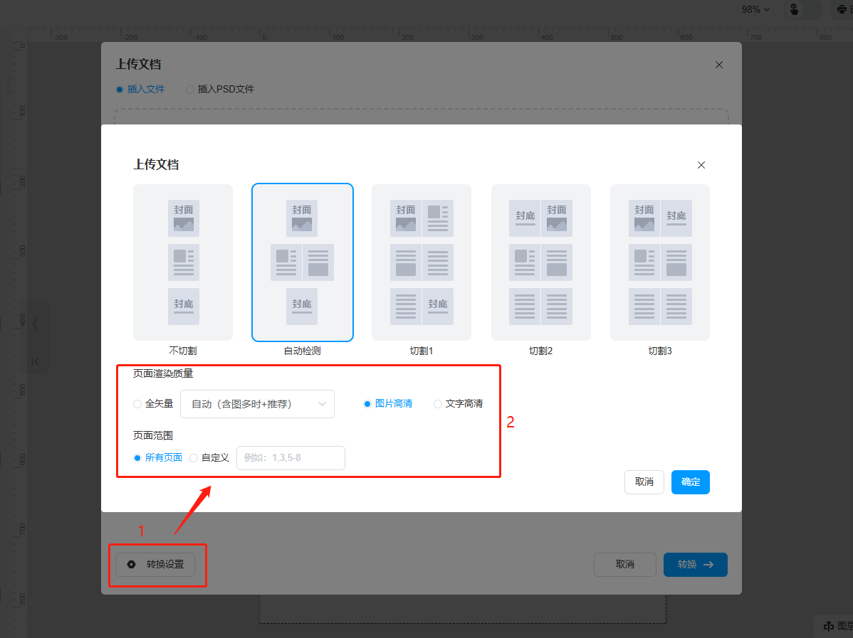 b)点击【转换设置】,根据你的需要,勾选页面分割模式以及页面渲染质量,设置页面范围,点击【确认】。如果你上传的文档是双页的,可以在上传之前选择切割方式后再上传文档,在上传界面点击转换设置,会弹出四种切割方式,根据你的文档排版风格来选择用哪种切割方式。
