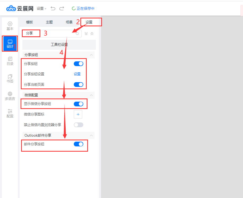在【设计】页面,点击【设置】,输入“分享关键字”搜索,勾选显示【分享按钮】