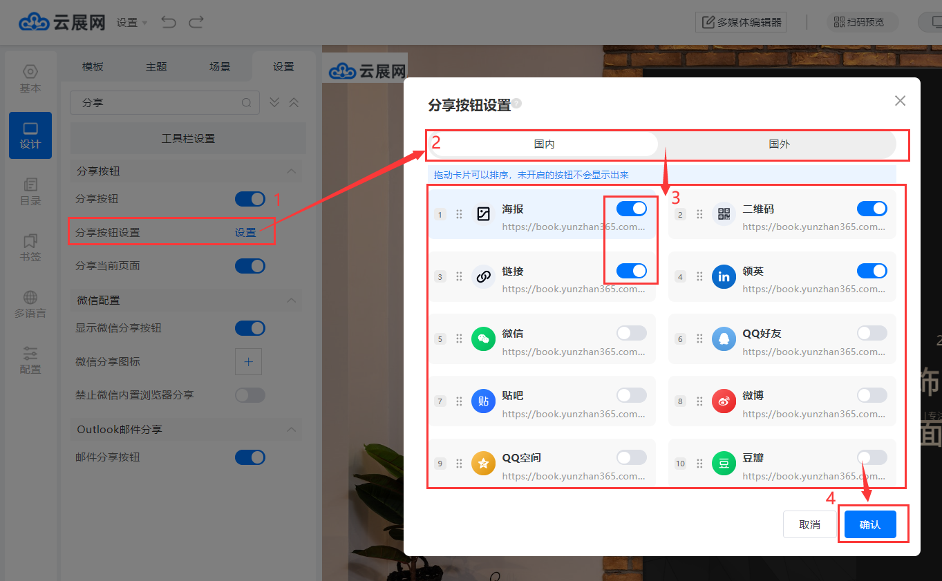 点击【分享按钮设置】,选择国内/国外分享按钮,自定义勾选分享配置,拖动卡片可以排序,设置好后点击【确认】