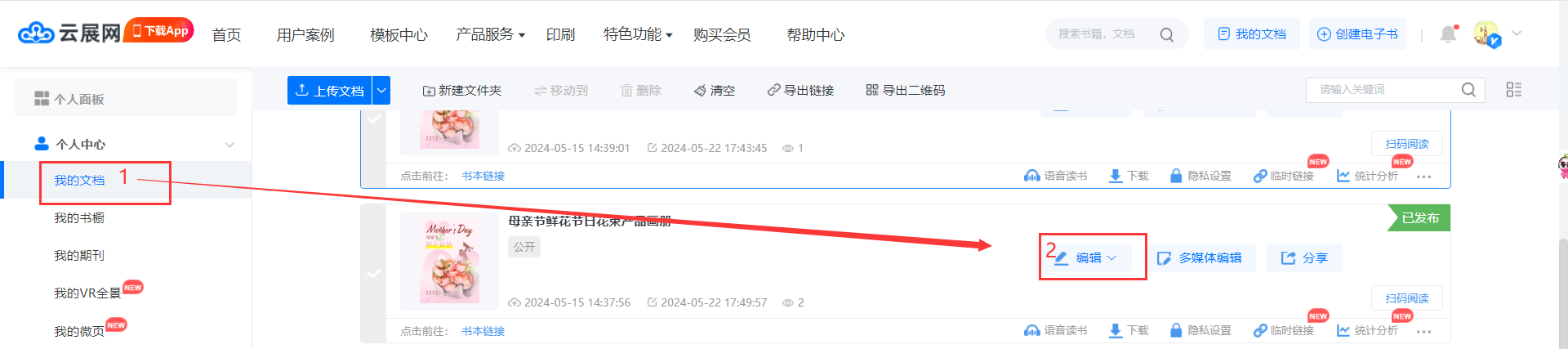 在【我的文档】页面,点击【编辑】进入