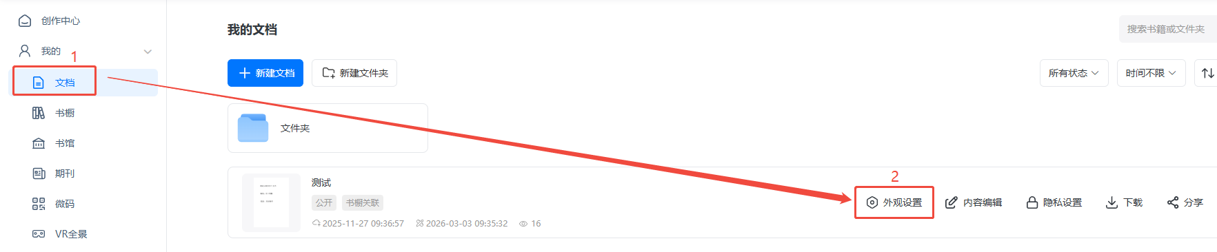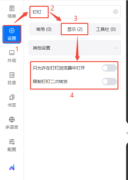 如何使电子书只能在钉钉上打开并禁止分享? 一、功能介绍 如果您的电子书需要仅在钉钉上可以打开观看,且无法分享给钉钉上的其他好友的话,是可以的。 在非钉钉的平台上打开电子书会显示“请在钉钉客户端打开链接”,且没有分享按钮,效果如下: 二、操作步骤 1、打开外观设置 点进【文档】,找到对应电子书,点击【外观设置】。 2、打开配置 点击【设置】,上方搜索栏搜索【钉钉】,然后点击【显示】,打开下方两个配置即可自动保存。
